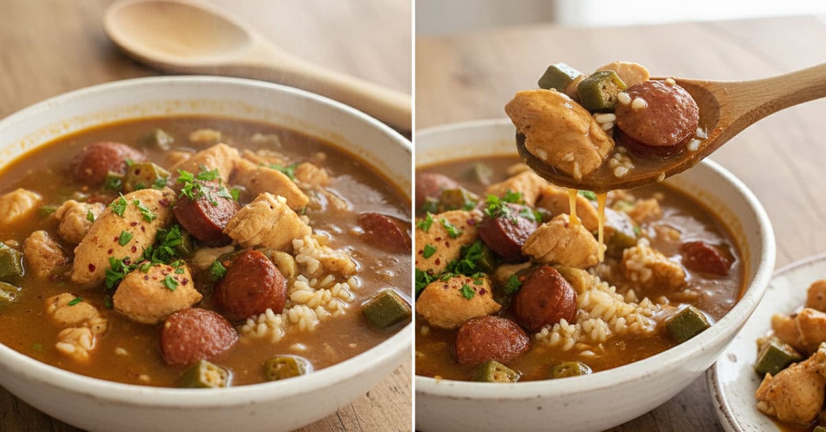 Cajun Chicken Gumbo combina caldo espesso, frango suculento e temperos marcantes — quer aprender a preparar essa tradição Cajun com técnica e sabor?