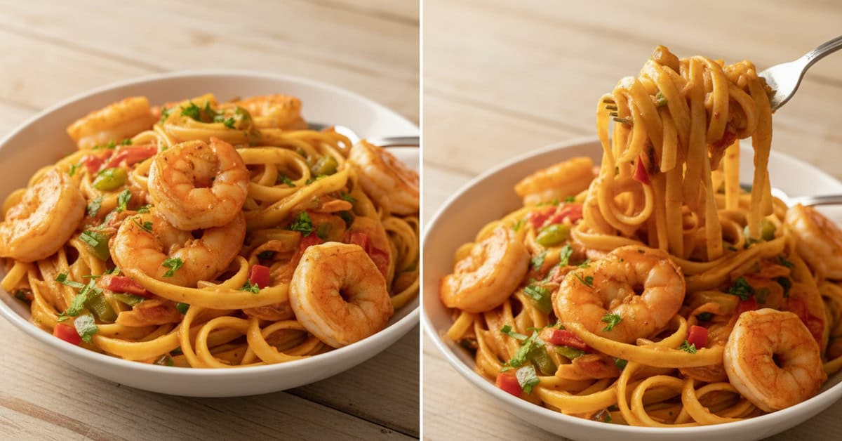 Cajun Shrimp Pasta é um prato cremoso de massa com camarões temperados no estilo cajun, combinando páprica, alho e pimenta para um sabor levemente picante; prepara-se em cerca de 25–35 minutos, ideal para jantares rápidos, podendo ajustar picância e substituir creme por opções sem lactose.