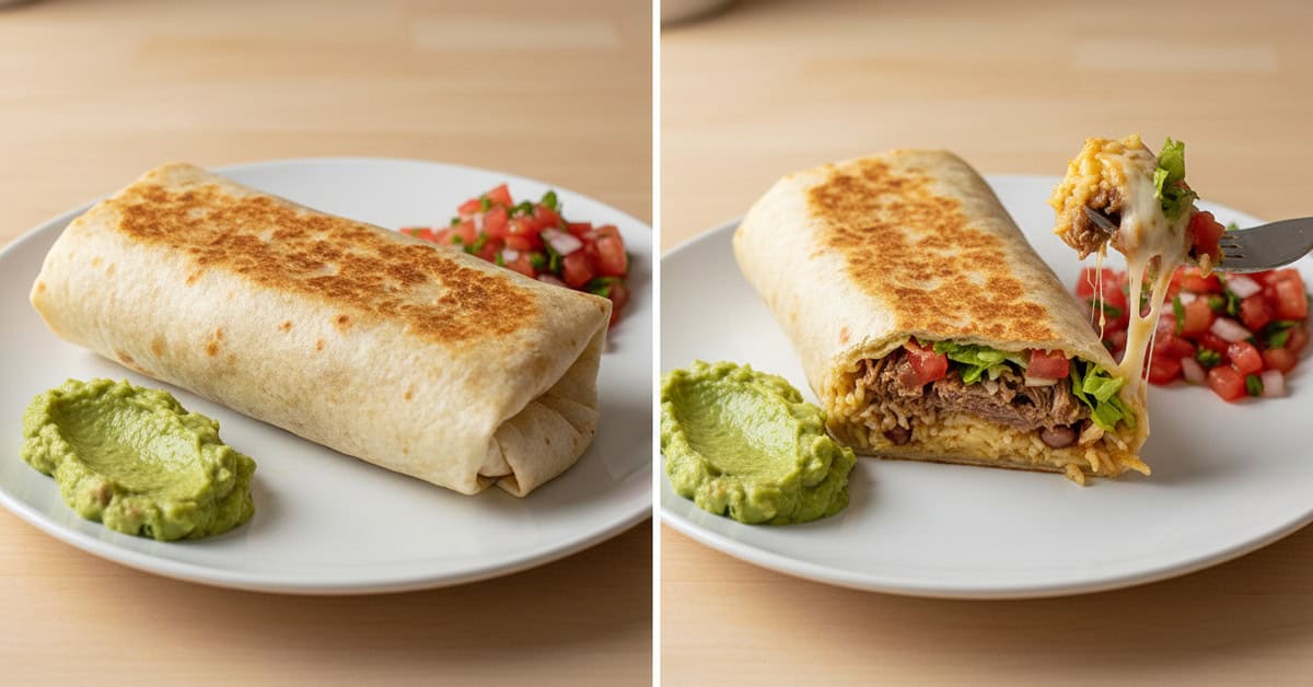 - Reaquecimento do refrigerado: forno a 180°C por 10–12 minutos com o burrito ainda embrulhado em alumínio ou frigideira por 3–4 minutos de cada lado até aquecer por completo.