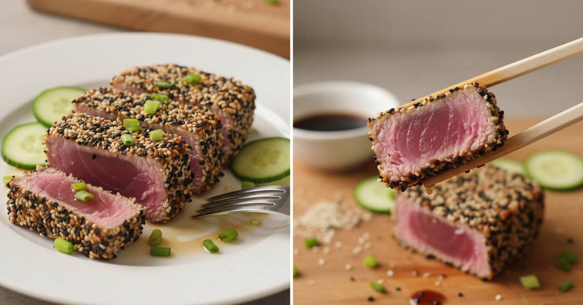 Deixe o atum descansar 1–2 minutos após selar; isso ajuda os sucos a se acomodarem e facilita o corte. Corte em fatias finas na diagonal e contra as fibras para textura macia.