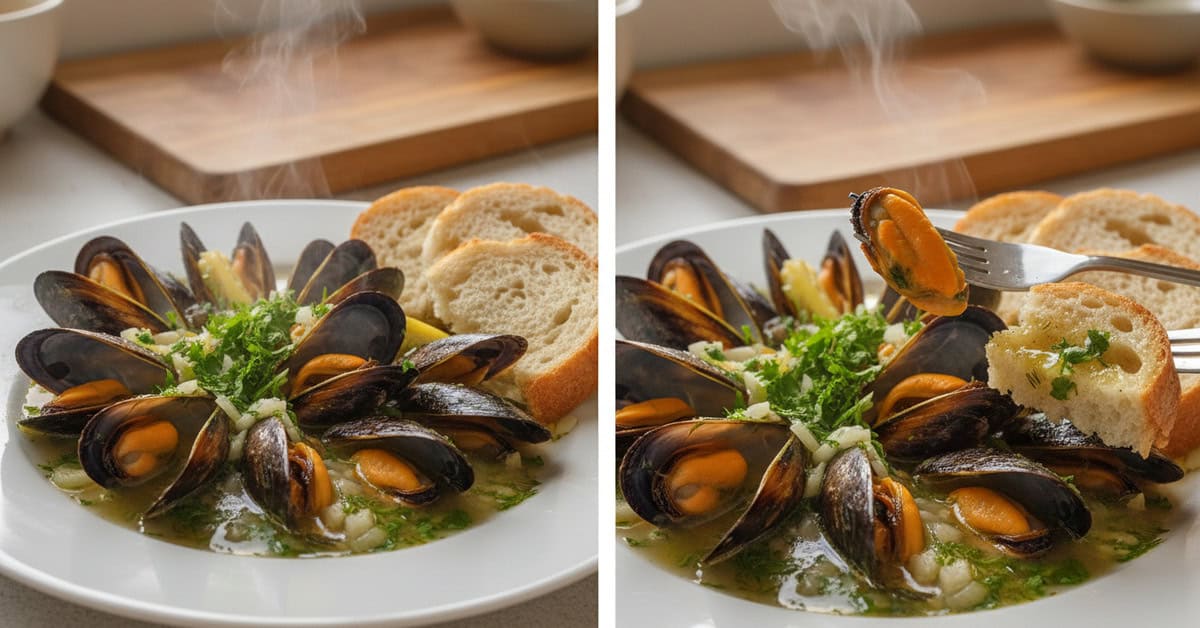 Apresentação: sirva os mexilhões em uma tigela funda com o caldo visível, fatias de pão ao lado e pequenas cumbias com molhos ou manteiga de ervas. Isso incentiva o compartilhamento e deixa o prato visualmente atraente.